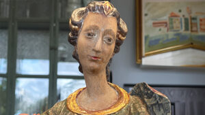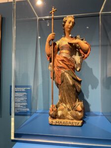 Parmi les œuvres exposées, vous pourrez admirer la Sainte Marguerite, une sculpture en bois polychrome que j’ai eu le plaisir de restaurer.